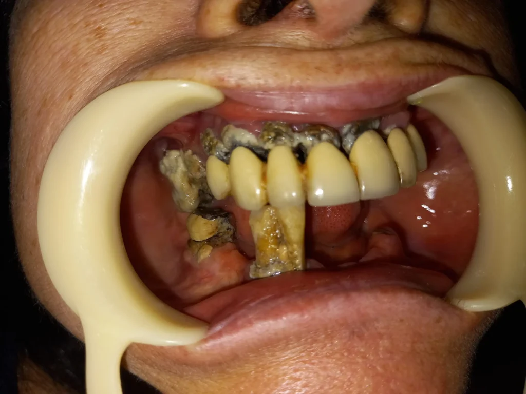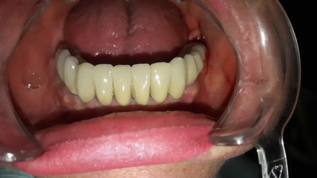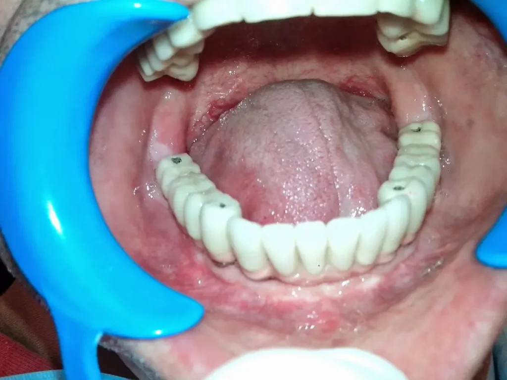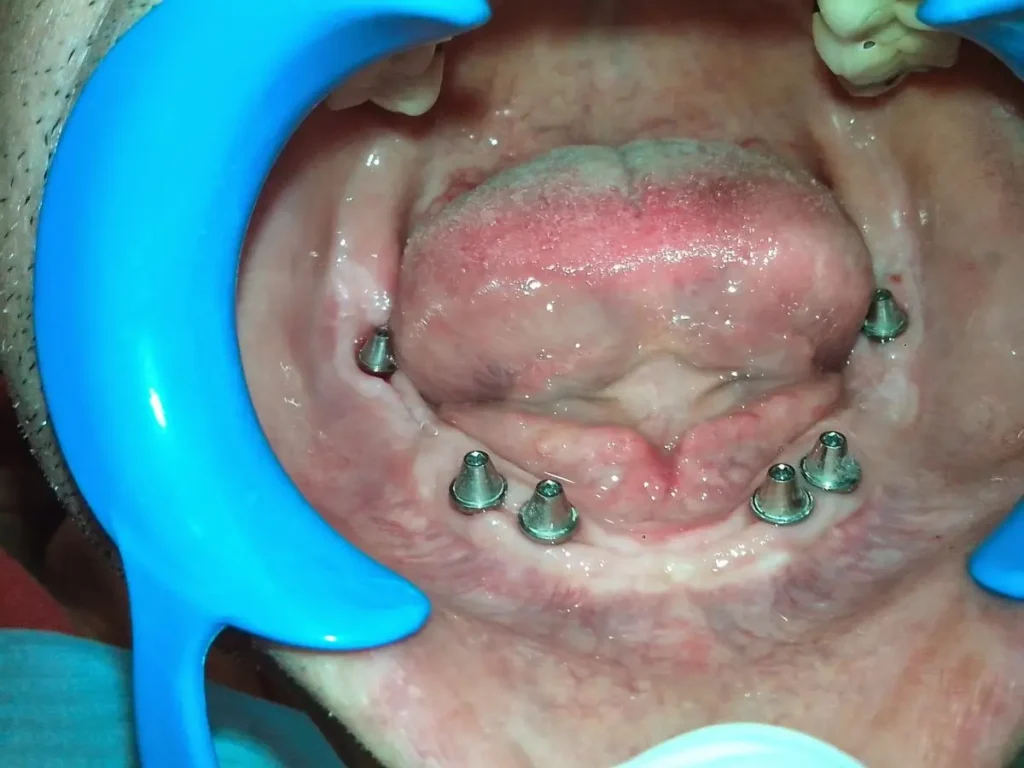 Αφού κάναμε εξαγωγή των φυσικών δοντιών, τοποθετήσαμε εμφυτεύματα για πλήρη, σταθερή αποκατάσταση.